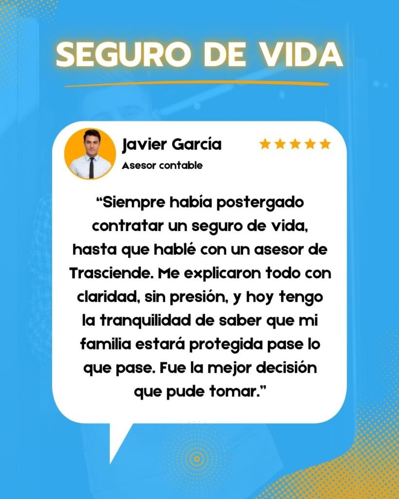 Soluciones para Protegerte en cada Etapa de Tus sueños Por que al cuidarte tu, cuidas a los tuyos. Asegurarte es un acto de amor que TRASCIENDE generaciones. Reservar cita CON LA CONFIANZA DE+ 480 CLIENTES La mejor propuesta a tus necesidades Porque tu bienestar y el de tu familia no se improvisa. Se planea, se protege… se Trasciende. Seguros de vida Protege y cuida a quienes más amas, incluso cuando tú ya no estés. Conoce mas Seguros de Salud Accede a atención médica privada de calidad sin desestabilizar tus finanzas. conoce mas Seguros de Autos e respaldamos ante cualquier imprevisto en el camino, con asistencia 24/7. conoce mas Quiero informacion Lo que la gente dice sobre nosotros Más que seguros, ofrecemos tranquilidad, respaldo y compromiso real contigo y tu familia.